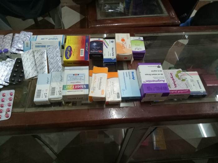 الفور حملة رقابية من إدارة التفتيش الصيدلي بمديرية الصحة لبحث الشكوى و أسفرت الحملة عن ضبط عدد 870 قرص أدوية جدول ثان مخدرات بدون فواتير وعدد 850 قرص أدوية وأمبول وعبوة ألبان خاص بوزارة الصحة والسكان والقوات المسلحة محظور تداولها او بيعها كما تم ضبط