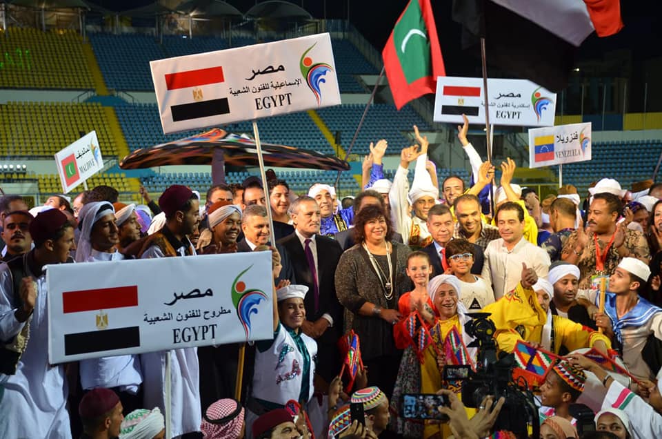 وفي ختام فقرات حفل الأفتتاح قامت الفرق بتقديم أستعراض جماعى ، على لحن المهرجان المميز “كل الشعوب جاية تغنى فى مهرجان الإسماعيلية ” في لوحة فنية رائعة تم التقاط الصور التذكارية لمحافظ الإسماعيلية و وزيرة الثقافة مع الفرق المشاركة .