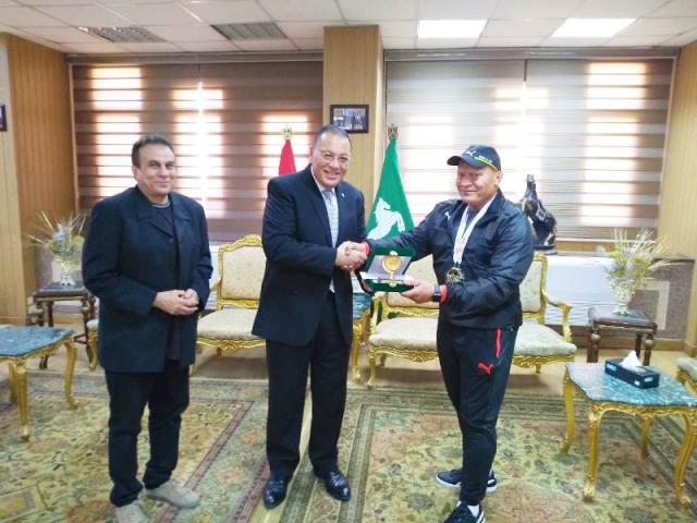 والسعادة لتواجده داخل مكتب محافظ الشرقية لتكريمه بعد أن حقق بطولة العالم
